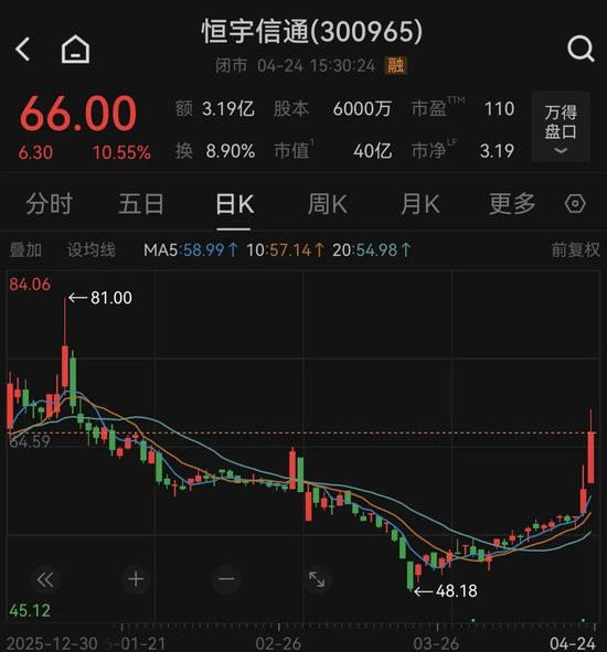 Wind数据露馅,4月24日,恒宇信通股价收报66元/股,涨幅为10.55%,市值为40亿元。值得扫视的是,易游app恒宇信通股价于1月12日波及阶段高点后合手续回落,4月23日、24日相连两个往复日,在航空航天板块拉升带动下,股价大幅高潮。本年以来,该股累计跌幅为6.57%。