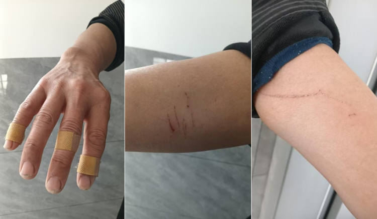 这才发现我方的手臂、手指被划伤